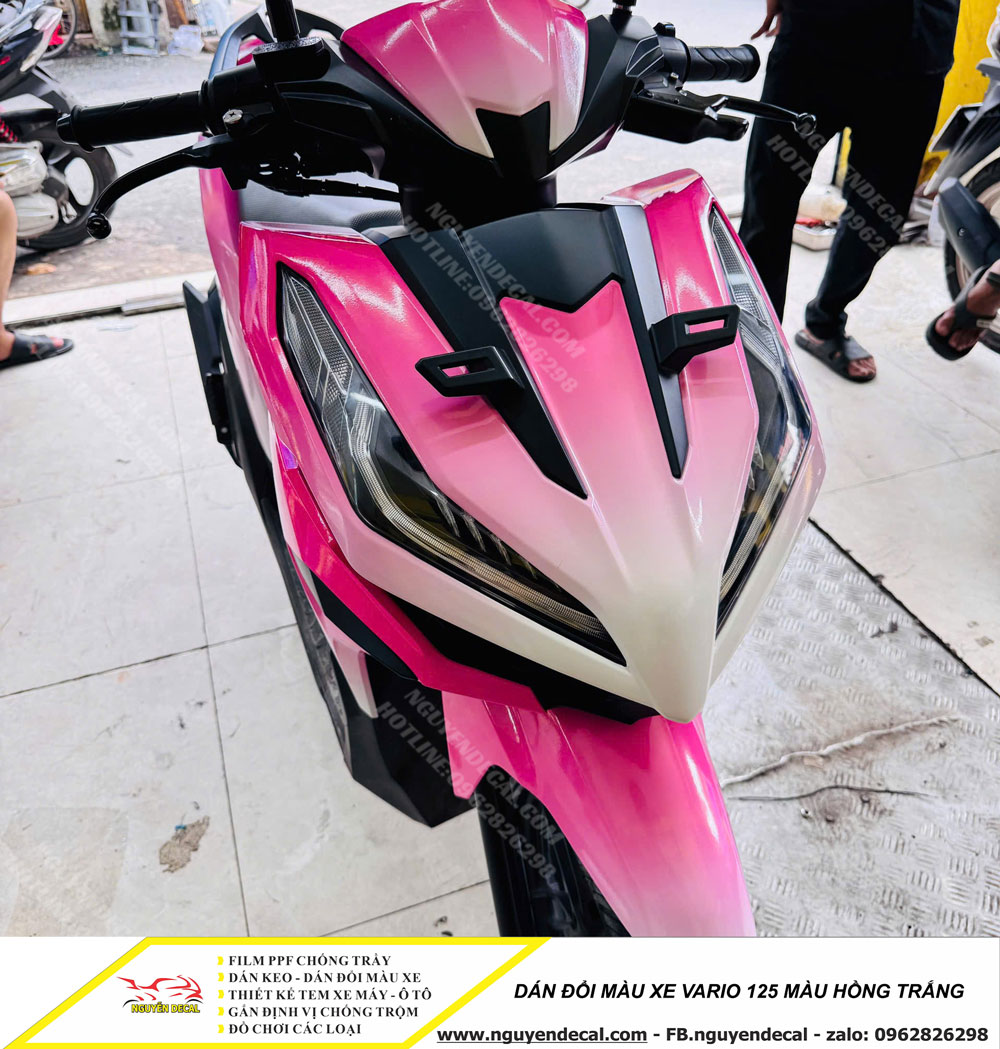 Tại Nguyễn Decal, dịch vụ dán đổi màu xe Vario 125 được thực hiện bằng decal cao cấp, có độ bền màu và độ bám dính cao, giúp bảo vệ lớp sơn zin khỏi trầy xước, phai màu do nắng hoặc nước. Màu hồng loang trắng tạo hiệu ứng chuyển màu mềm mại, sang trọng, mang đến vẻ đẹp nổi bật nhưng vẫn giữ được nét thanh lịch cho chiếc xe.