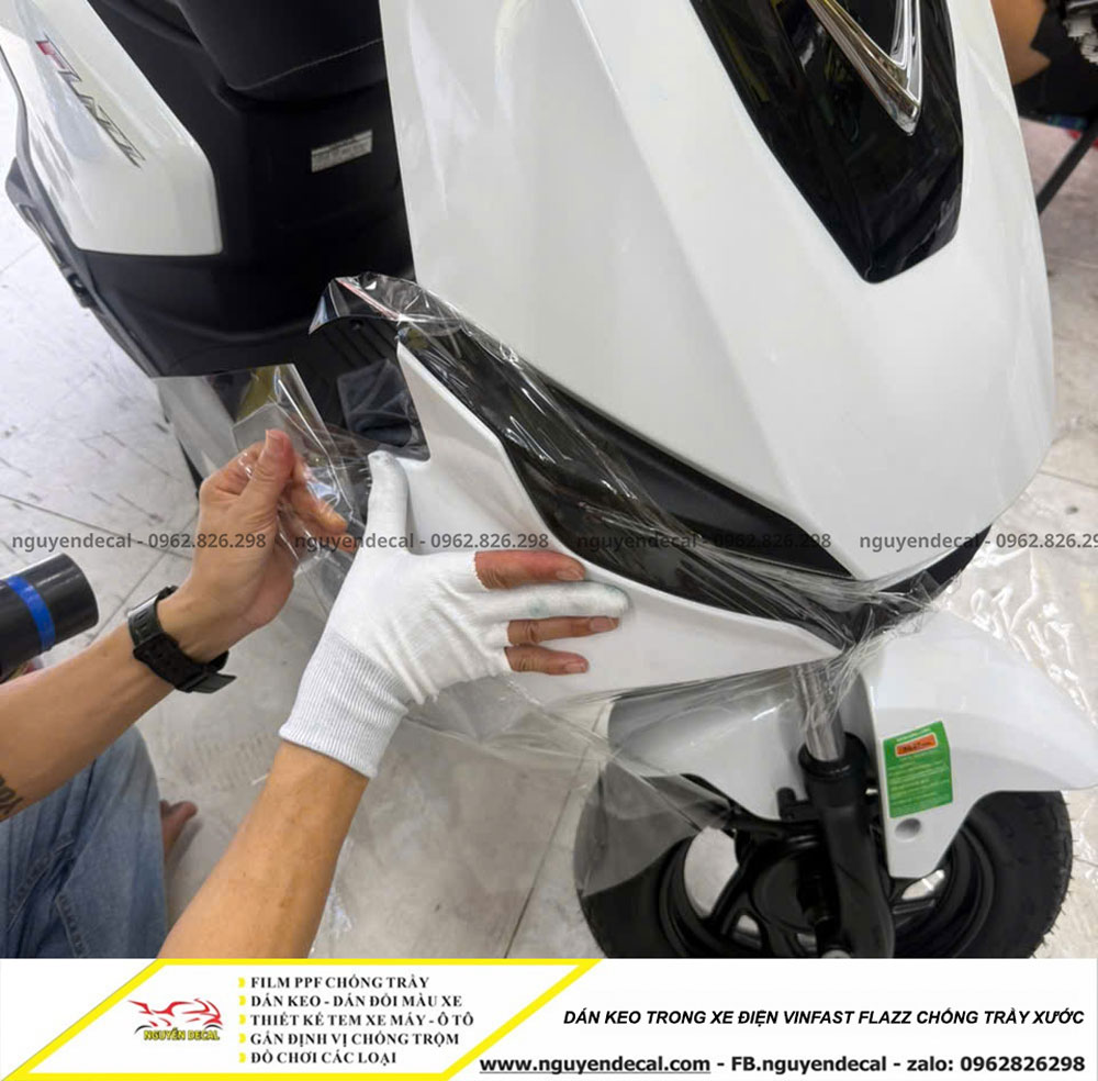 Tại Nguyễn Decal, dịch vụ dán keo trong cho xe VinFast Flazz sử dụng chất liệu decal 3 lớp cao cấp, độ bám dính tốt, chống nước và hạn chế ố vàng theo thời gian. Keo được thi công tỉ mỉ theo từng chi tiết như dàn áo, yếm, mặt nạ và các vị trí dễ trầy xước. Sau khi dán, bề mặt xe vẫn bóng đẹp tự nhiên, không lộ mép keo, đảm bảo tính thẩm mỹ cao.